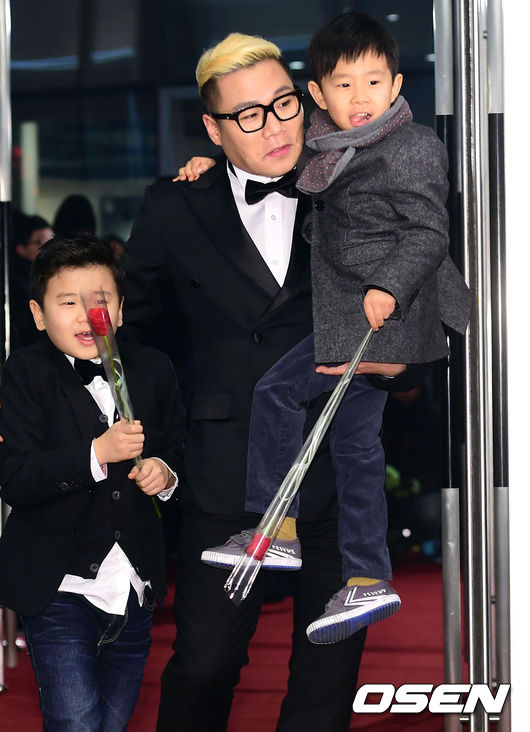 29일 오후 서울 상암 MBC 미디어센터 공개홀에서 진행된 'MBC 방송연예대상'에서 윤민수와 윤후, 김민율이 포즈를 입장하고 있다.