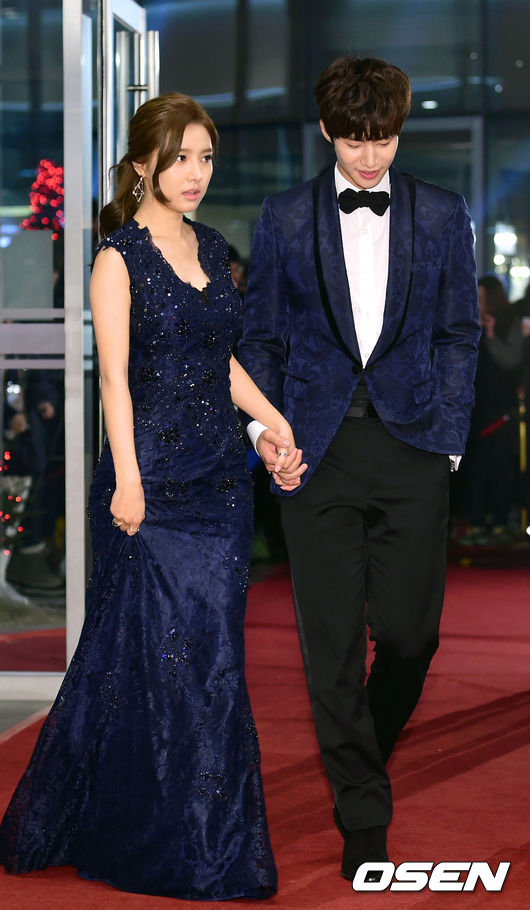 29일 오후 서울 상암 MBC 미디어센터 공개홀에서 진행된 'MBC 방송연예대상'에서 송재림과 김소은이 입장하고 있다.