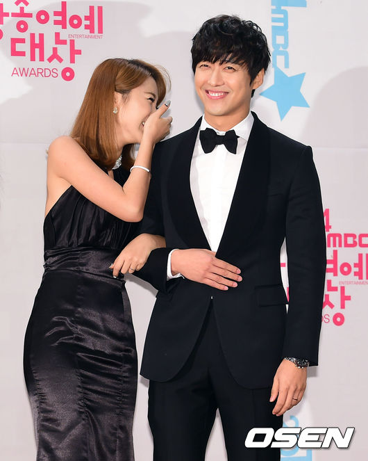 29일 오후 서울 상암 MBC 미디어센터 공개홀에서 진행된 'MBC 방송연예대상'에서 홍진영과 남궁민이 미소 짓고 있다.