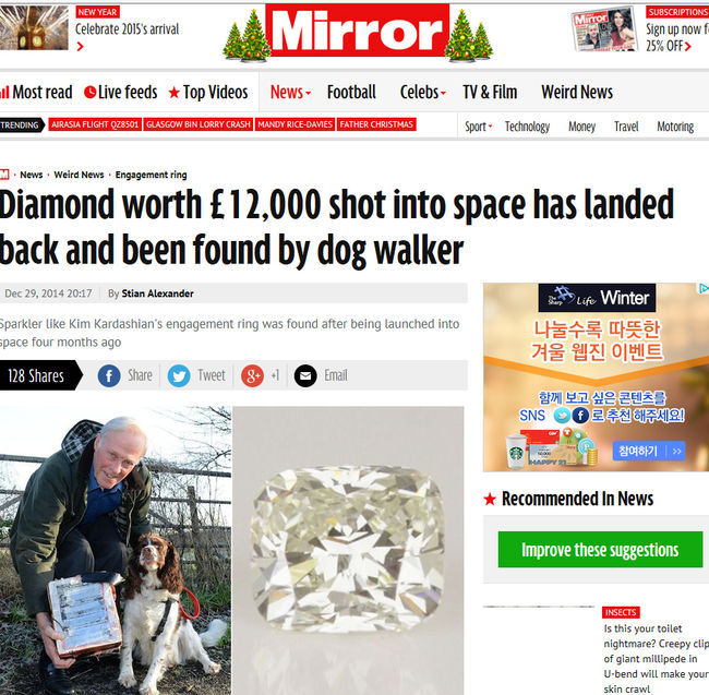 '미러'에 따르면 이 다이아몬드는 분실품이 아니라 한 회사의 이벤트로 공중에서 뿌려진 것이다. 영국의 보석회사 '77 다이아몬드'에서는 회사 홍보를 위해 지난 8월 7일 헬륨 풍선에 매달아 10만 피트(30.48km) 상공에서 다이아몬드를 떨어트렸다.