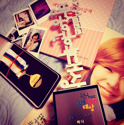함께 공개된 사진 속에는 MBC ‘방송연예대상’ 라디오 신인상 트로피와 함께 메달, 팬들의 편지의 모습이 담겨있다.