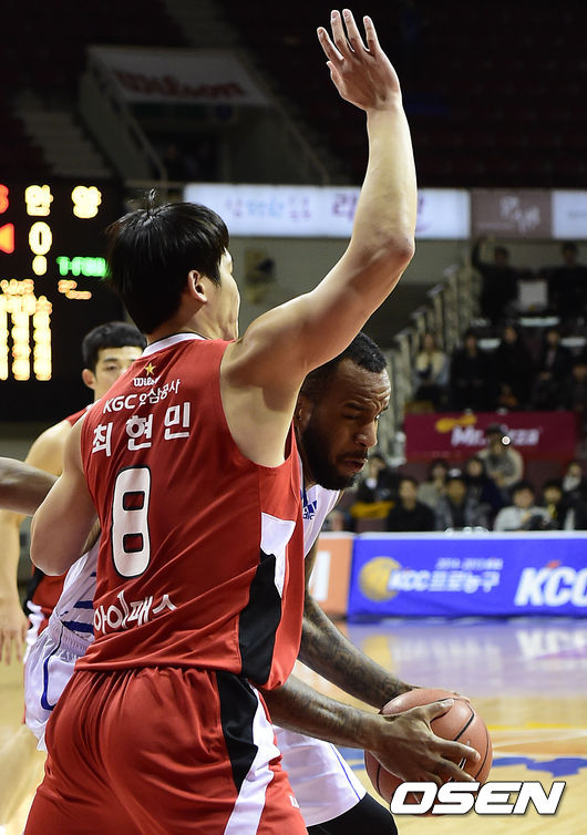 30일 오후 안양실내체육관에서 열린 '2014-2015 KCC 프로농구' 안양 KGC와 서울 삼성의 경기, 1쿼터 안양 최현민이 삼성 라이온스의 돌파를 막아서고 있다.
