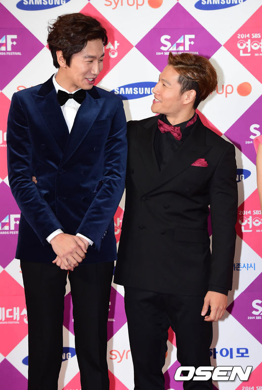 30일 오후 서울 삼성동 코엑스에서 열린 SBS 연예대상 포토월 행사에서 이광수와 김종국이 포토타임을 갖고 있다.
