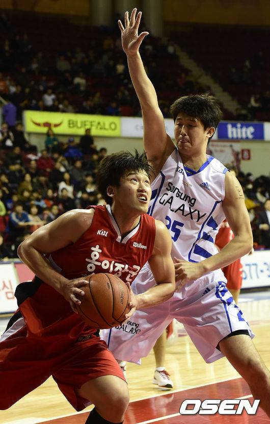 30일 오후 안양실내체육관에서 열린 '2014-2015 KCC 프로농구' 안양 KGC와 서울 삼성의 경기, 4쿼터 안양 최현민이 서울 김명훈의 수비를 피해 돌파에 성공하고 있다.