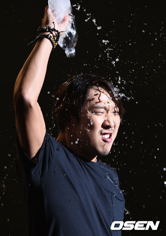 가수 하하가 공연 중 물을 뿌리고 있다.