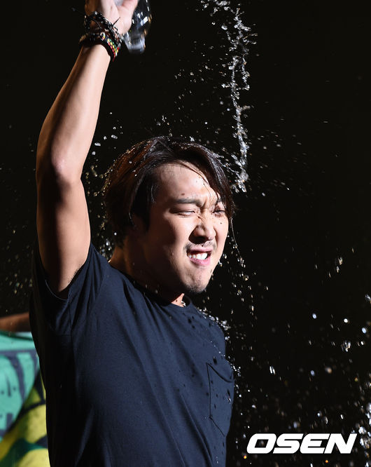 가수 하하가 공연 중 물을 뿌리고 있다.