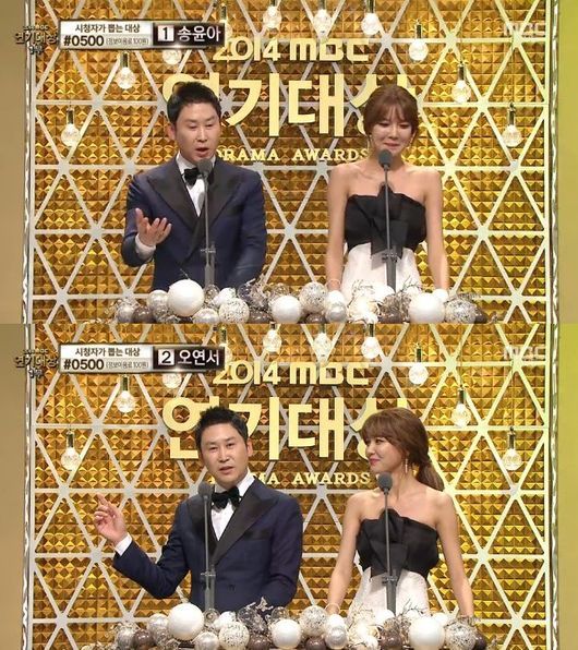 이날 MBC 연기대상은 신동엽과 수영의 진행으로 이뤄졌다. 대상 후보는 '마마'의 송윤아, '왔다 장보리'의 이유리, 오연서가 올랐으며 이들 중 실시간 문자투표로 가장 높은 득표를 한 후보가 대상으로 선정된다.