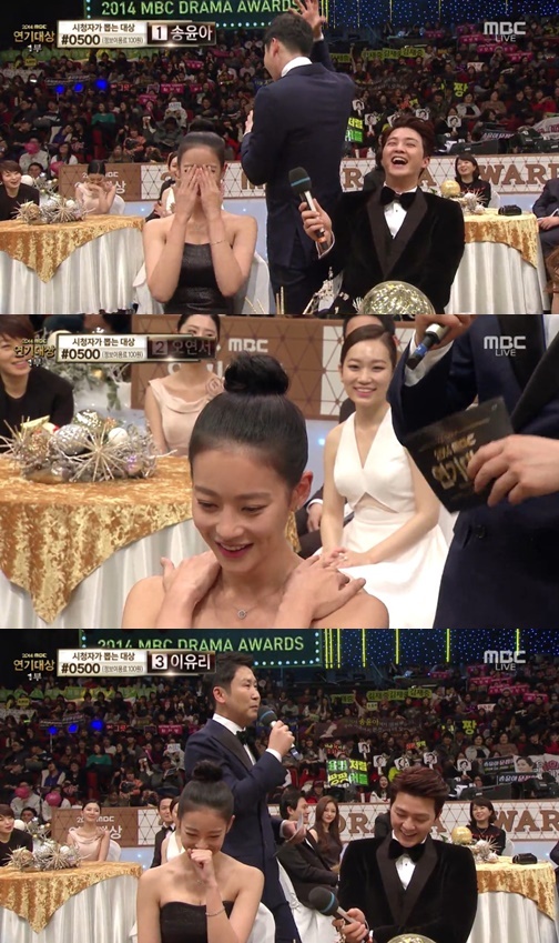 이날 MBC 연기대상은 신동엽과 수영의 진행으로 이뤄졌다. 대상 후보는 ‘마마’의 송윤아, ‘왔다 장보리’의 이유리, 오연서가 올랐으며 이들 중 실시간 문자투표로 가장 높은 득표를 한 후보가 대상으로 선정된다.