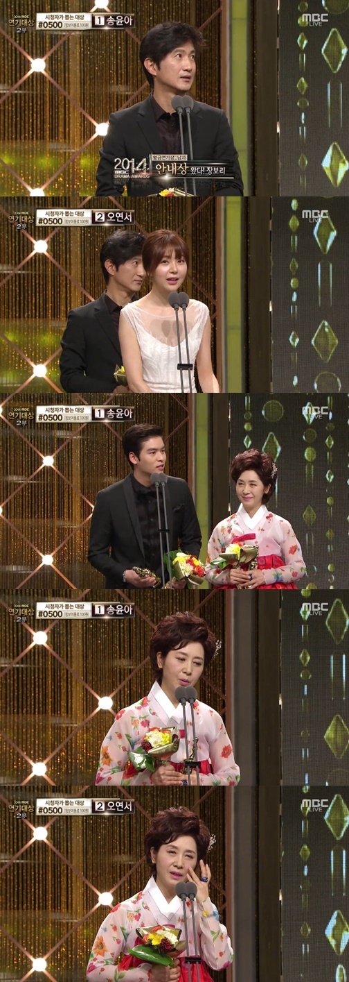 안내상, 최민수, 김혜옥 이미숙은 30일 오후 8시 55분 서울 상암동 신사옥에서 열린 2014 연기대상에서 황금연기상을 수상했다.