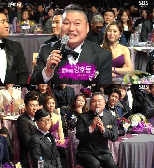 강호동은 30일 오후 서울 삼성동 코엑스에서 열린 2014 SBS 연예대상에서 "우리 친구 유재석 씨가 예능인 최초로 지상파 3사 수상해도 저에겐 기쁜 일"이라고 말했다.