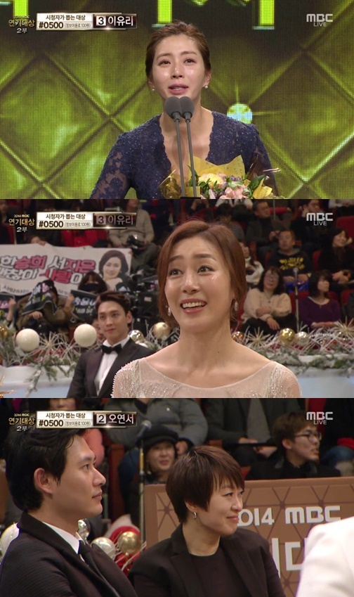 이날 MBC 연기대상은 신동엽과 수영의 진행으로 이뤄졌다. 대상 후보는 ‘마마’의 송윤아, ‘왔다 장보리’의 이유리, 오연서가 올랐으며 이들 중 실시간 문자투표로 가장 높은 득표를 한 후보가 대상으로 선정된다.