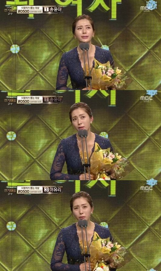 송윤아는 이날 최우수상을 받았지만, 대상 그 이상의 의미를 가져갔다. 4년 만에 복귀작이기도 했던 이번 상은 그의 아팠던 날들과 슬펐던 날들을 배우로서 보상받게 해준 자리였으리라. 송윤아가 흘린 눈물은 감격이자 감사함이었다.