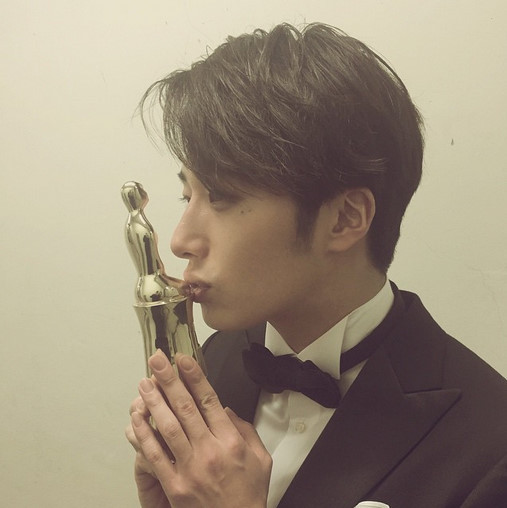 배우 정일우가 트로피 키스로 수상의 기쁨을 표현했다.