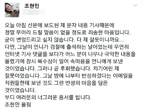 조 전무는 "오늘 아침 신문에 보도된 제 문자 내용 기사 때문에 정말 무어라 드릴 말씀이 없을 정도로 죄송한 마음입니다"라며 "언니가 검찰에 출석하는 날이었는데 우연히 인터넷 기사 댓글을 보다가 어느 분이 너무나 극악한 내용을 올렸기에 잠시 복수심이 일어 속마음을 언니에게 보낸 것이었습니다. 그러나 곧 후회했습니다"라고 문자 메시지를 보낸 이유를 설명했다.