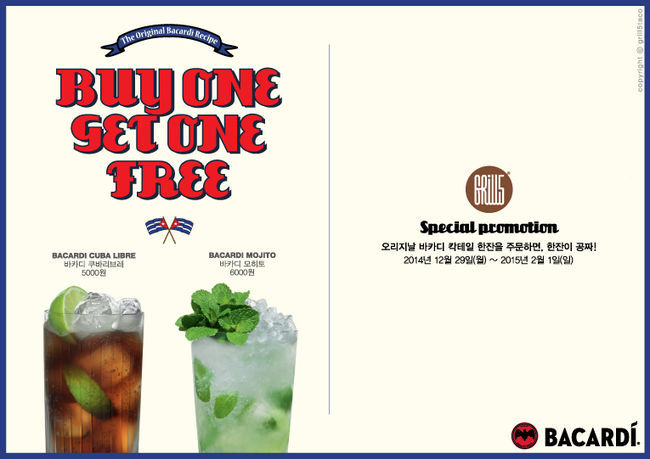 럼 브랜드 바카디(BACARDI)는 젊은 감각의 멕시칸 레스토랑인 그릴파이브타코에서 '오리지널 바카디 쿠바리브레(BACARDI Cuba Libre)'와 '오리지널 바카디 모히토(BACARDI Mojito)' 판매를 시작해 2월1일까지 '1+1칵테일 이벤트'를 실시한다고 밝혔다.