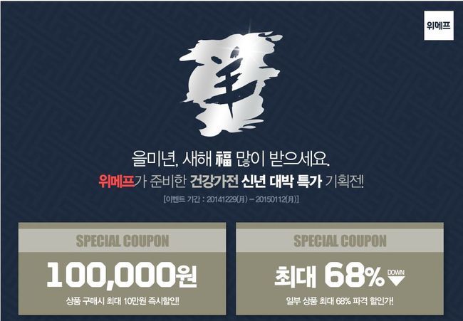 소셜커머스 위메프는 새해를 맞아 내년 1월 12일까지 건강가전 기획전을 개최한다고 31일 밝혔다. 이번 기획전을 통해 1만 원부터 최대 10만 원까지 즉시 할인을 받을 수 있다.