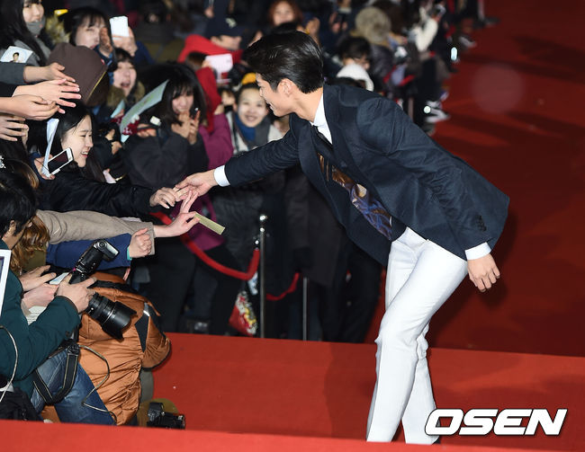31일 오후 서울 여의도 KBS홀에서 진행되는 '2014 KBS 연기대상'에 앞서 박보검이 팬과 악수를 나누고 있다.