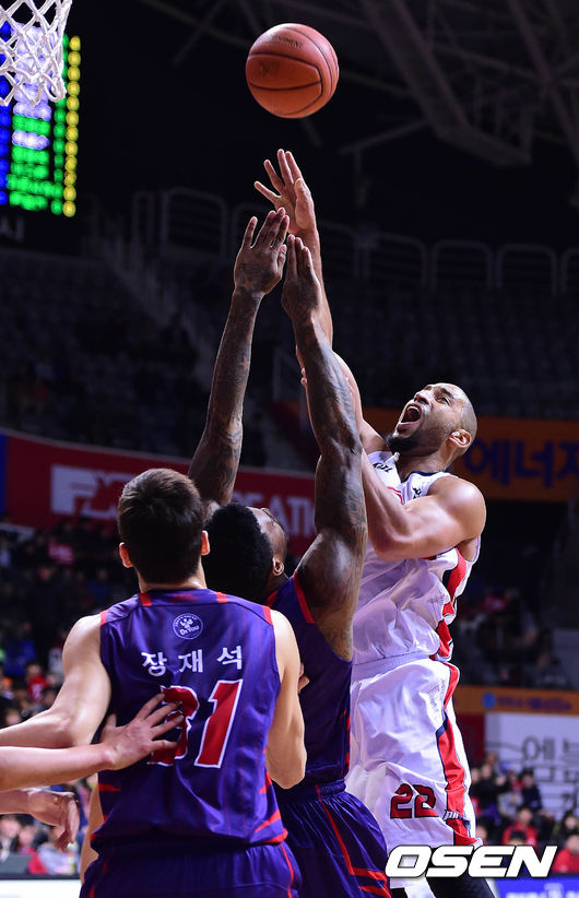 31일 오후 고양체육관에서 열린 '2014-2015 KCC 프로농구' 고양 오리온스와 울산 모비스의 경기 1쿼터 클라크가 가르시아를 앞에두고 슛을 시도하고 있다.