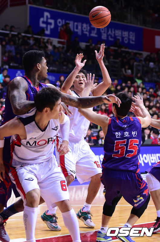 31일 오후 고양체육관에서 열린 '2014-2015 KCC 프로농구' 고양 오리온스와 울산 모비스의 경기 2쿼터 함지훈이 골밑쪽으로 패스를 하고 있다.