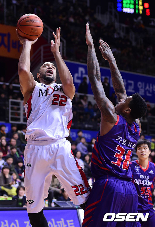 31일 오후 고양체육관에서 열린 '2014-2015 KCC 프로농구' 고양 오리온스와 울산 모비스의 경기 2쿼터 클라크가 가르시아를 앞에두고 슛을 하고 있다.