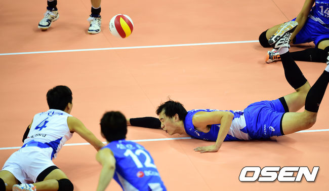 1세트 우리카드 정민수와 김정환이 공을 살리기위해 몸을 날리고 있다.