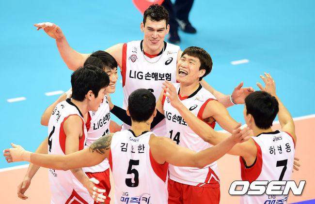득점을 올린 LIG 선수들이 기뻐하고 있다.