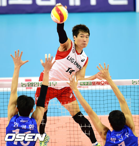 2세트 LIG 김진만이 공격을 시도하고 있다.