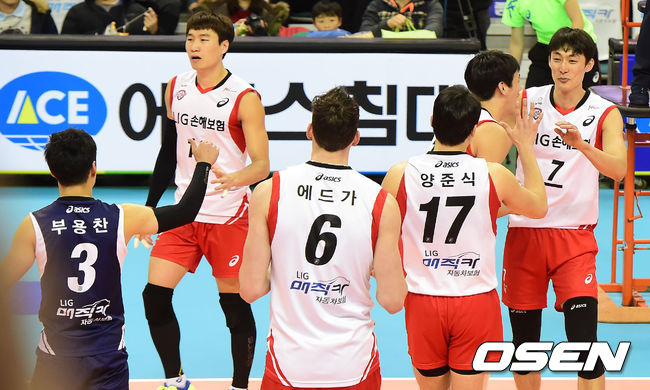 LIG손해보험이 우리카드를 꺾고 4라운드 첫 경기를 승리로 장식했다.