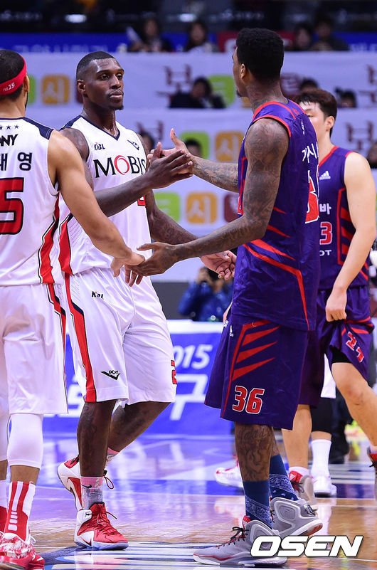 31일 오후 고양체육관에서 열린 '2014-2015 KCC 프로농구' 고양 오리온스와 울산 모비스의 경기 종료 후 라틀리프와 가르시아가 인사를 나누고 있다.