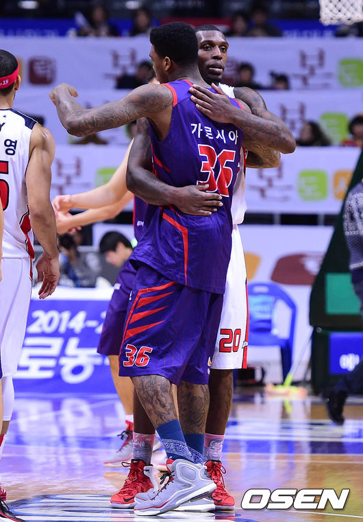 31일 오후 고양체육관에서 열린 '2014-2015 KCC 프로농구' 고양 오리온스와 울산 모비스의 경기 종료 후 라틀리프와 가르시아가 포옹을 나누고 있다.