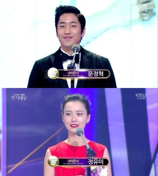 문정혁과 정유미는 31일 오후 서울 여의도 KBS홀에서 열린 2014 KBS 연기대상에서 네티즌 상을 수상했다.