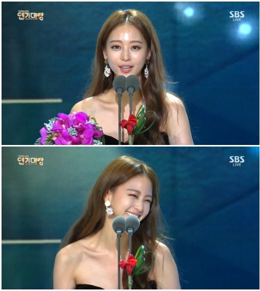 한예슬은 31일 오후 8시 55분 서울 강남구 삼성동 코엑스에서는 '2014 SBS 연기대상'에서 중편드라마 우수연기상을 수상했다.