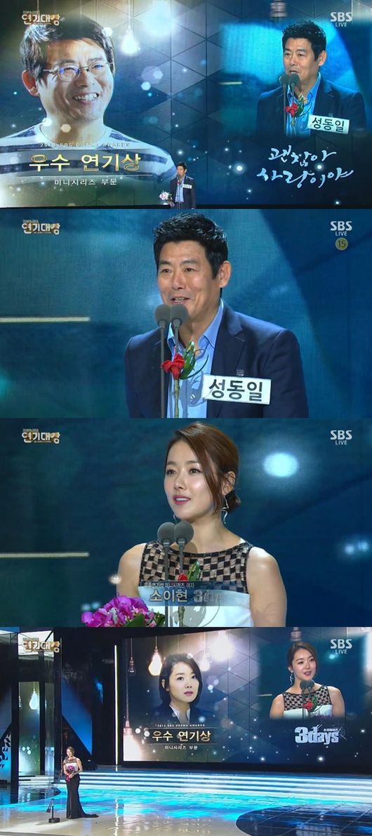 성동일과 소이현은 31일 오후 8시 55분 서울 삼성동 코엑스 D홀에서 열린 2014 SBS 어워즈 페스티벌 연기대상에서 미니시리즈 부문 우수 연기상을 수상했다.