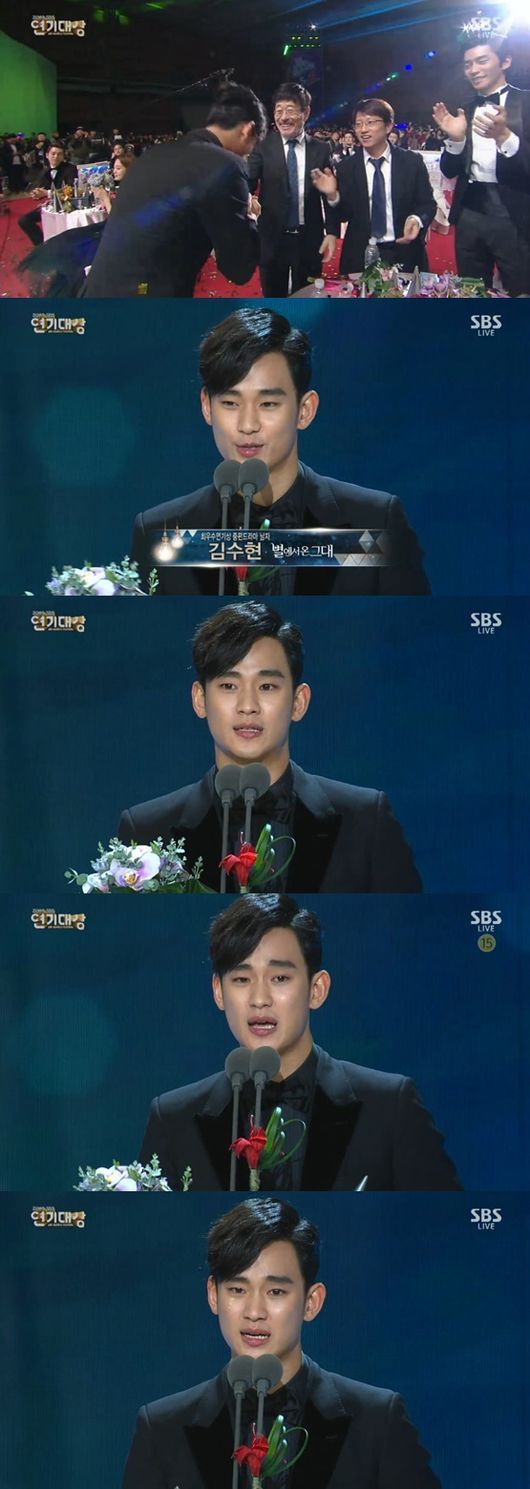 김수현은 “아름다운 어머니 항상 사랑한다”고 운을 뗀 후, ‘별에서 온 그대’ 제작진과 배우들의 이름을 언급하며 감사 인사를 전했다. 또 김수현은 울먹거리며 소속사 관계자들에게 고마움을 전했다.