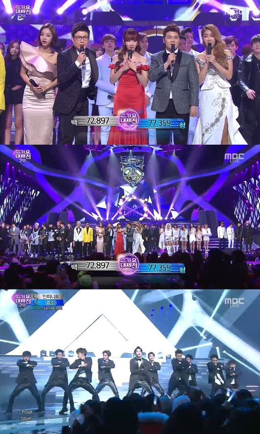 이날 문자 투표 중간 집계 결과 백팀은 1만 6128표, 청팀은 1만 2698표로 백팀이 앞서가고 있었다. 그러나 방송 중반 이후 엑소의 무대가 공개된 뒤 청팀이 많은 표를 얻으면서 역전승 했다.