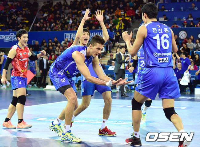 3세트 득점을 올린 대한항공 선수들이 기뻐하고 있다. / youngrae@osen.co.kr