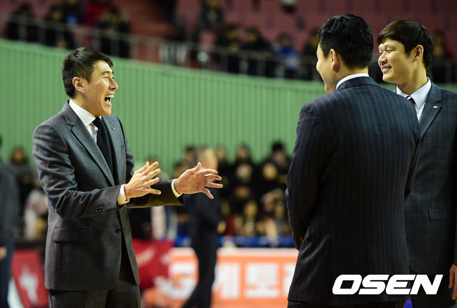 경기에 앞서 삼성 이상민 감독이 박훈근, 이규섭 코치와 이야기를 나누고 있다.