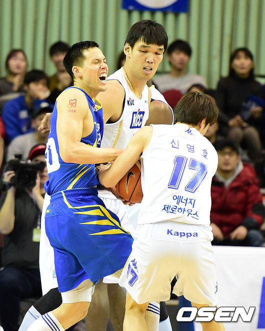 2쿼터 KCC 신명호가 삼성 이동준의 볼을 가로채고 있다.