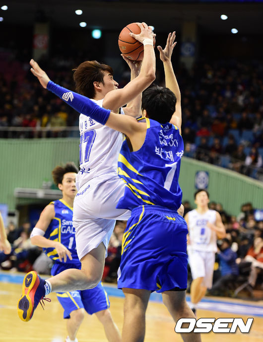 2쿼터 KCC 신명호가 삼성 박재현의 수비를 피해 레이업을 시도하고 있다.