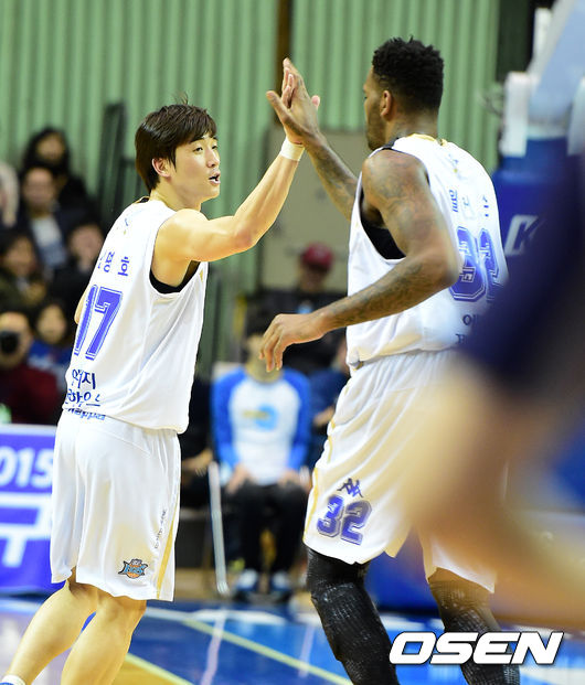 2쿼터 KCC 신명호가 3점슛을 성공시키고 윌커슨과 하이파이브를 하고 있다.