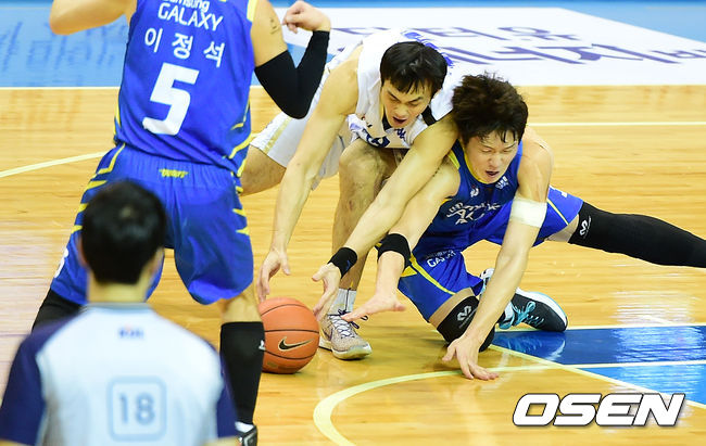 3쿼터 KCC 김태홍이 삼성 이정석, 김준일과 볼을 다투고 있다.