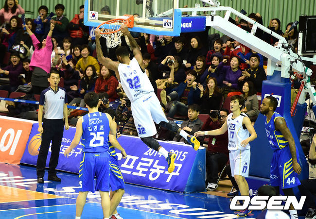 4쿼터 KCC 윌커슨이 투핸드 덩크를 성공시키고 있다.