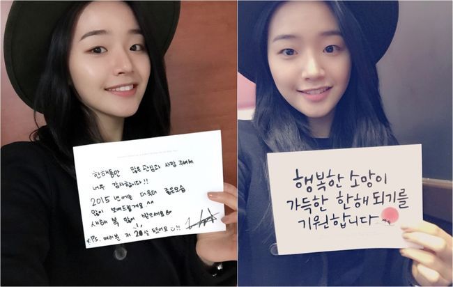 공개된 사진 속 지헤라는 감사한 마음을 담아 손수 작성한 자필 연하장을 들고 환한 미소로 인사를 전하고 있다. 지헤라는 자필 편지를 통해 “한 해 동안 많은 관심과 사랑 주셔서 너무 감사합니다!! 2015년에는 더욱 더 좋은 모습 많이 보여드릴게요^^ 새해 복 많이 받으세요”라고 감사인사와 2015년을 맞이하는 각오를 밝혀 눈길을 끌었다.