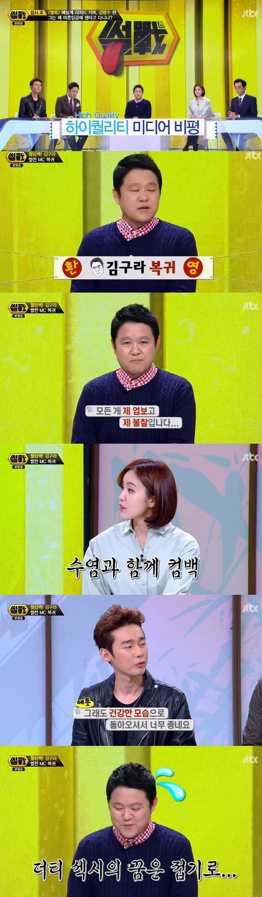 지난달 공황장애로 방송활동을 중단했던 김구라는 1일 오후 방송된 JTBC '썰전' 2부 코너 '예능심판자'에 복귀, “모든 게 제 업보이고 제 불찰이다”고 말했다.