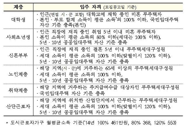 새 입주기준은 작년 7월 31일 입법예고한 바 있으며 세대주 요건만 완화됐다. 즉 ‘무주택세대주’ 요건은 ‘무주택세대구성원’으로 변경됐다. 특히, 사회초년생은 대학생설명회 등에서 제시된 의견을 반영하여 당초 ‘무주택세대주’에서 ‘무주택자’로 자격을 완화했다.