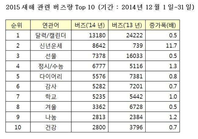 그 결과 '달력 (캘린더)'이 1만 3000여 건으로 1위를 기록했고, '신년운세'가 8600건, '선물'이 7400건으로 각각 2위와 3위를 차지했다. 이밖에 Top 10의 주요 키워드로는 '수능/정시','학교/입시' 등 교육과 진학 관련 버즈가 많았고, '다이어리', '나눔', '건강'등의 키워드 들도 상위권에 올라 연말연시의 특성을 반영하는 것으로 드러났다.