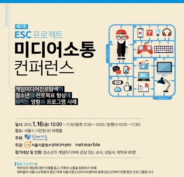 이번 컨퍼런스에서는 한국청소년연구원, 서울시교육청 장학사, 서울시청소년미디어센터 상담사, 서울 청운중학교 학부모 및 넷마블게임즈 인사지원실장 등 학계와 일선 전문가들이 청소년 진로교육의 중요성, 자녀지도, 게임미디어 산업의 동향과 진로전망 등을 주제로 사례 강연을 진행한다.