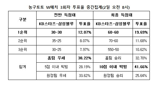 최종 KB스타즈 60점대-삼성블루 60점대 19.69%로 최다 집계…3일(토) 오후 6시 50분 마감
