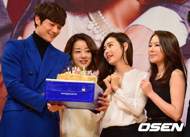 배우 박탐희가 2일 오후 서울 목동 SBS에서 열린 아침드라마 '황홀한 이웃' 제작발표회에 참석해 동료 배우들에게 생일 축하 이벤트를 받고 있다.