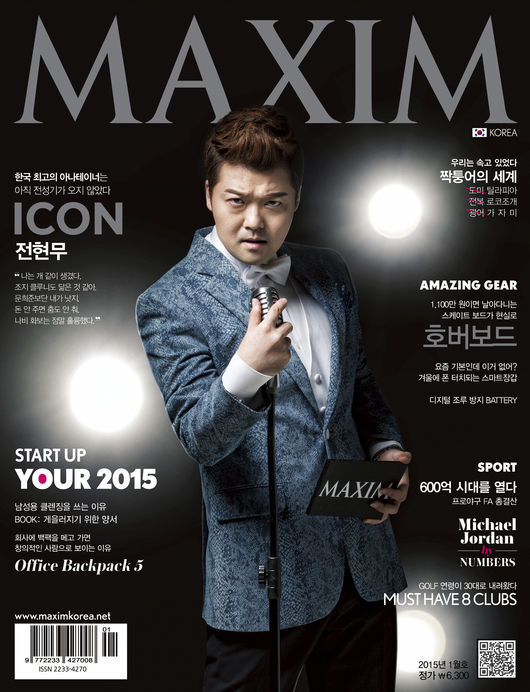 라디오 고정 MC, 지상파 연말 시상식 진행, 종편 인기 프로그램 '히든 싱어', '비정상회담' 진행 등 전천후 MC로 맹활약 중인 방송인 전현무가 잡지 MAXIM의 2015년 1월호의 표지 모델로 등장해 인터뷰를 나눴다.